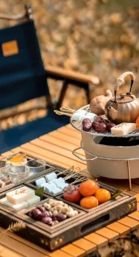 油茶花清香伴随着阵阵微风扑面而来,热乎乎的烤柿子、皮壳崩开的甜栗子、皮薄香糯的小红薯...一口热茶一口小食,时节更迭的浪漫与融融暖意,都在一场茶事中得以安顿~